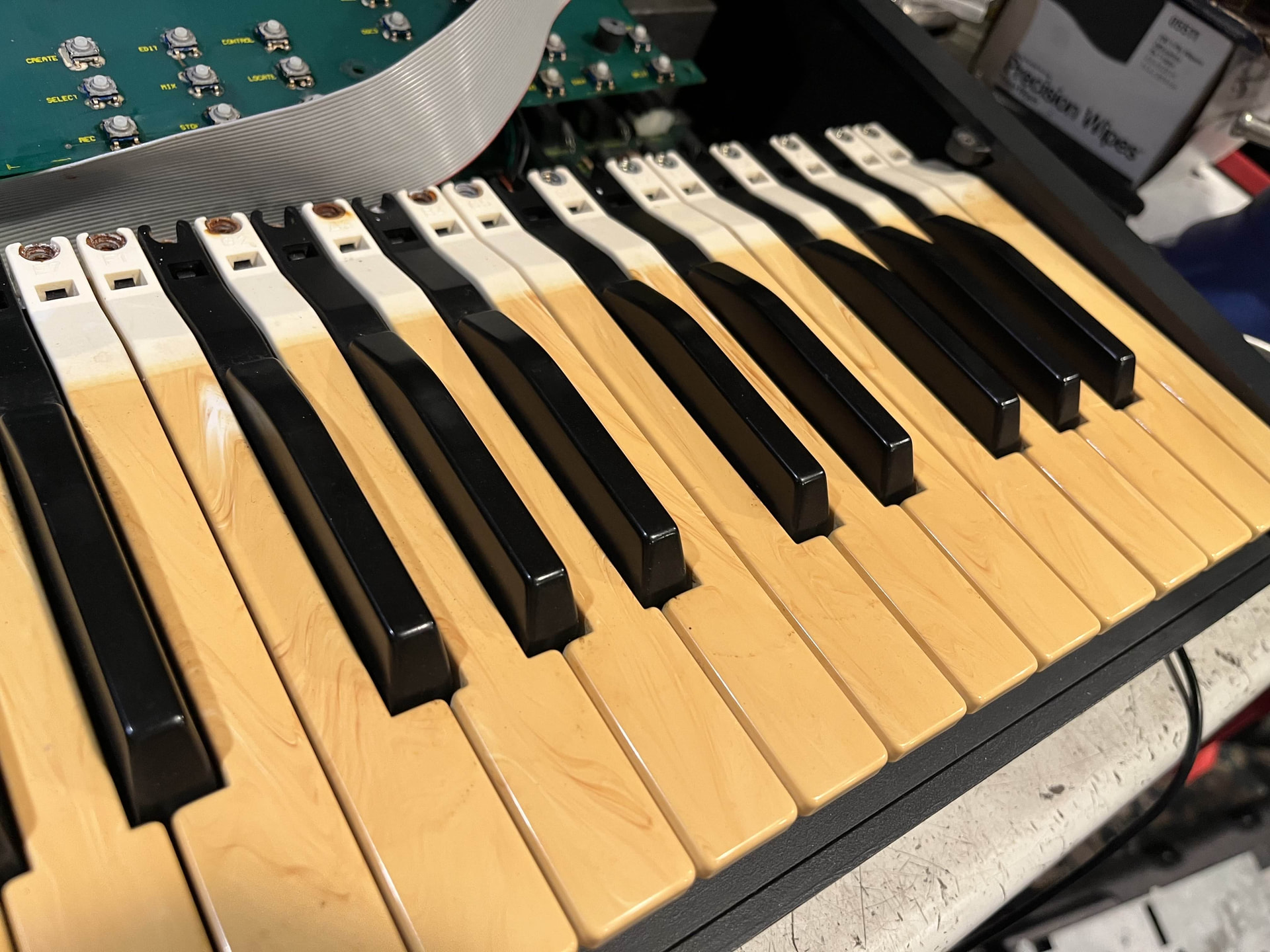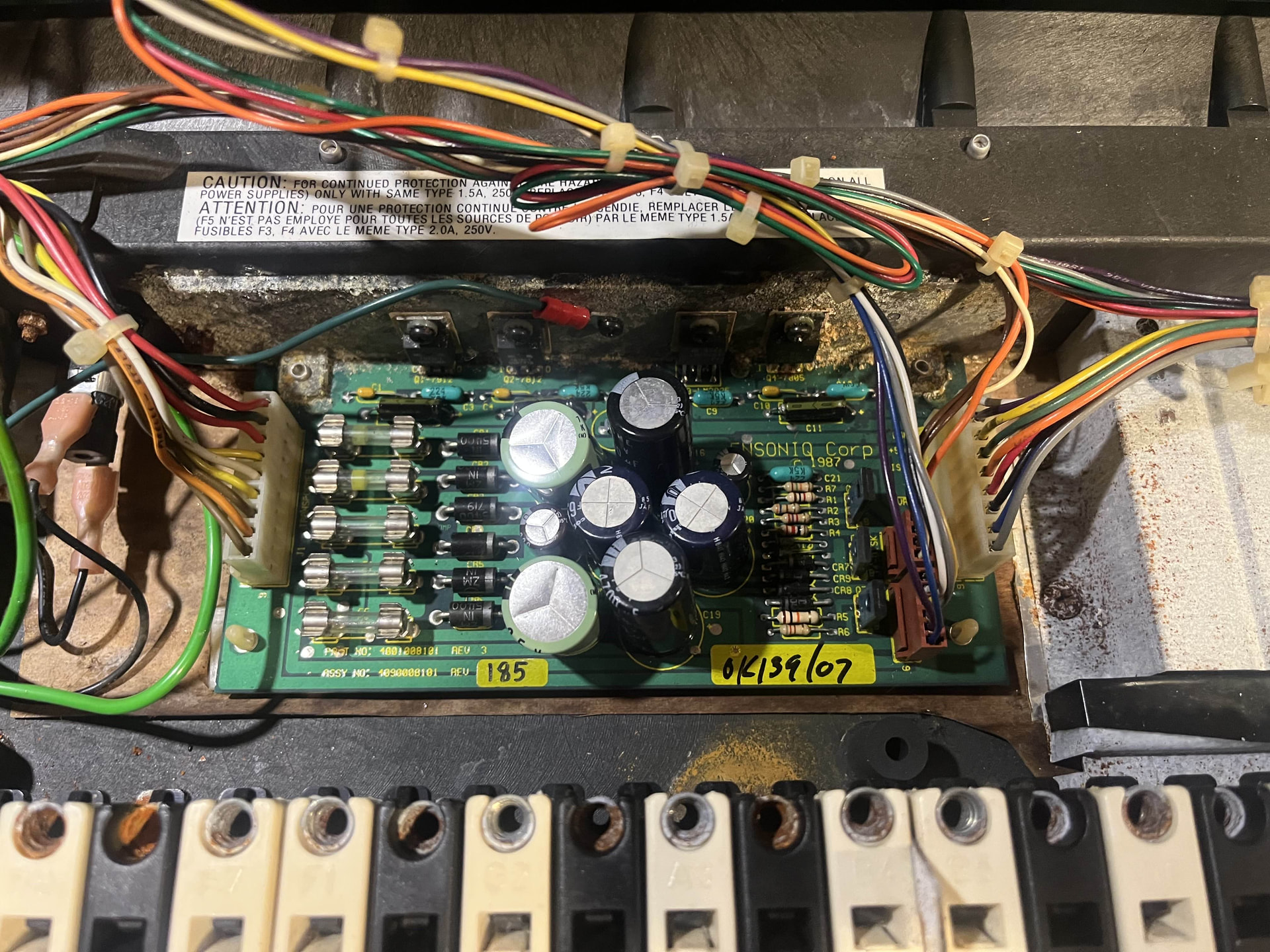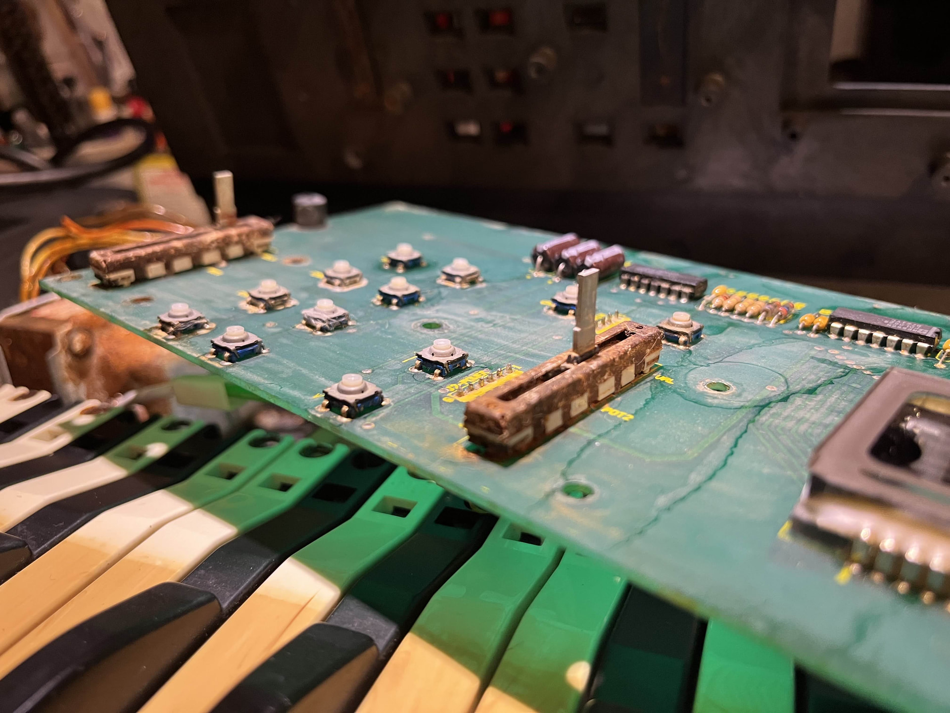 At some point this poor thing had a bath in some kind of liquid, as almost every single piece of metal has some sort of rust or corrosion on it. The keybed is super yellowed and almost looks like it has fake wood grain on it. Also it does not work (I know, what a shocker). No sound output and nothing on the display. Now although I’m new to synthesizers, I’ve been repairing retro game consoles for quite some time and am currently studying electrical engineering, so I’m not a complete newbie.