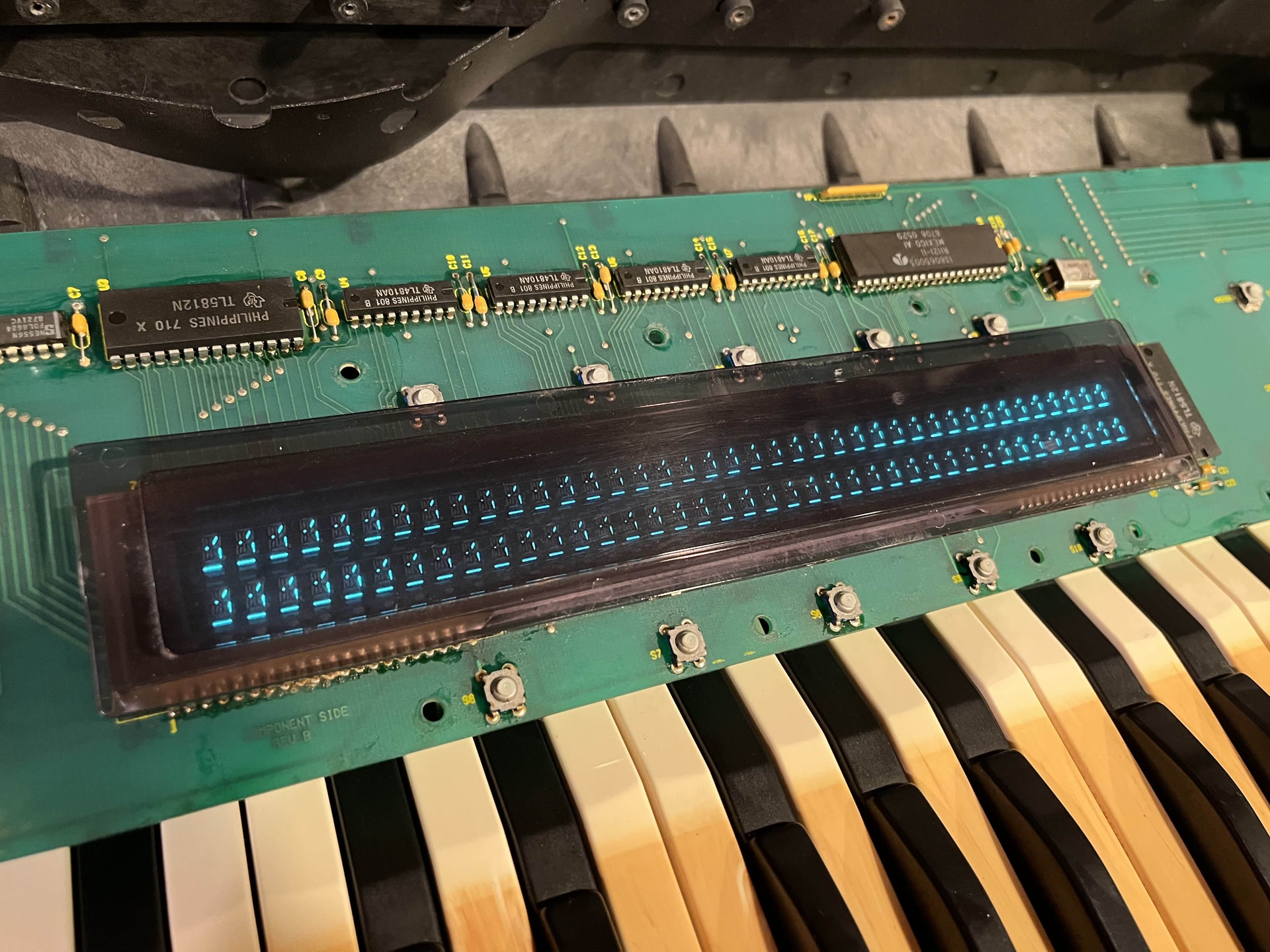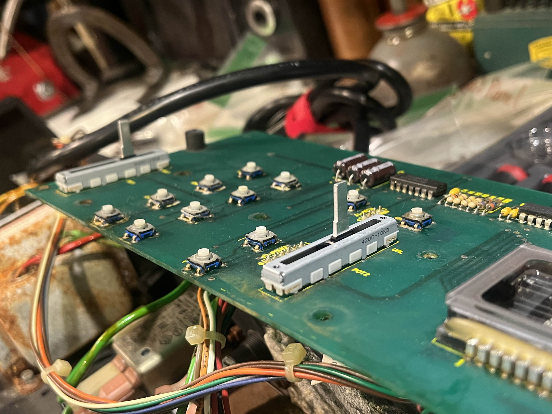 I then started diagnosing the display board. I unplugged the 4-pin connector so that it wouldn’t receive any data from the main board, which should have put it in the test mode where button presses should display random characters on screen. This did not work and no characters appeared. HOWEVER, I also had ordered a set of replacement faders for my volume and data entry sliders that were rusted in place (thanks again for the parts Syntaur), and when I soldered the new ones in and plugged everything back in, my display was on and displaying random segments across the entire display. I don’t know if this was because the heat from the soldering iron reflowed a cold joint or just from me unplugging and replugging connectors.