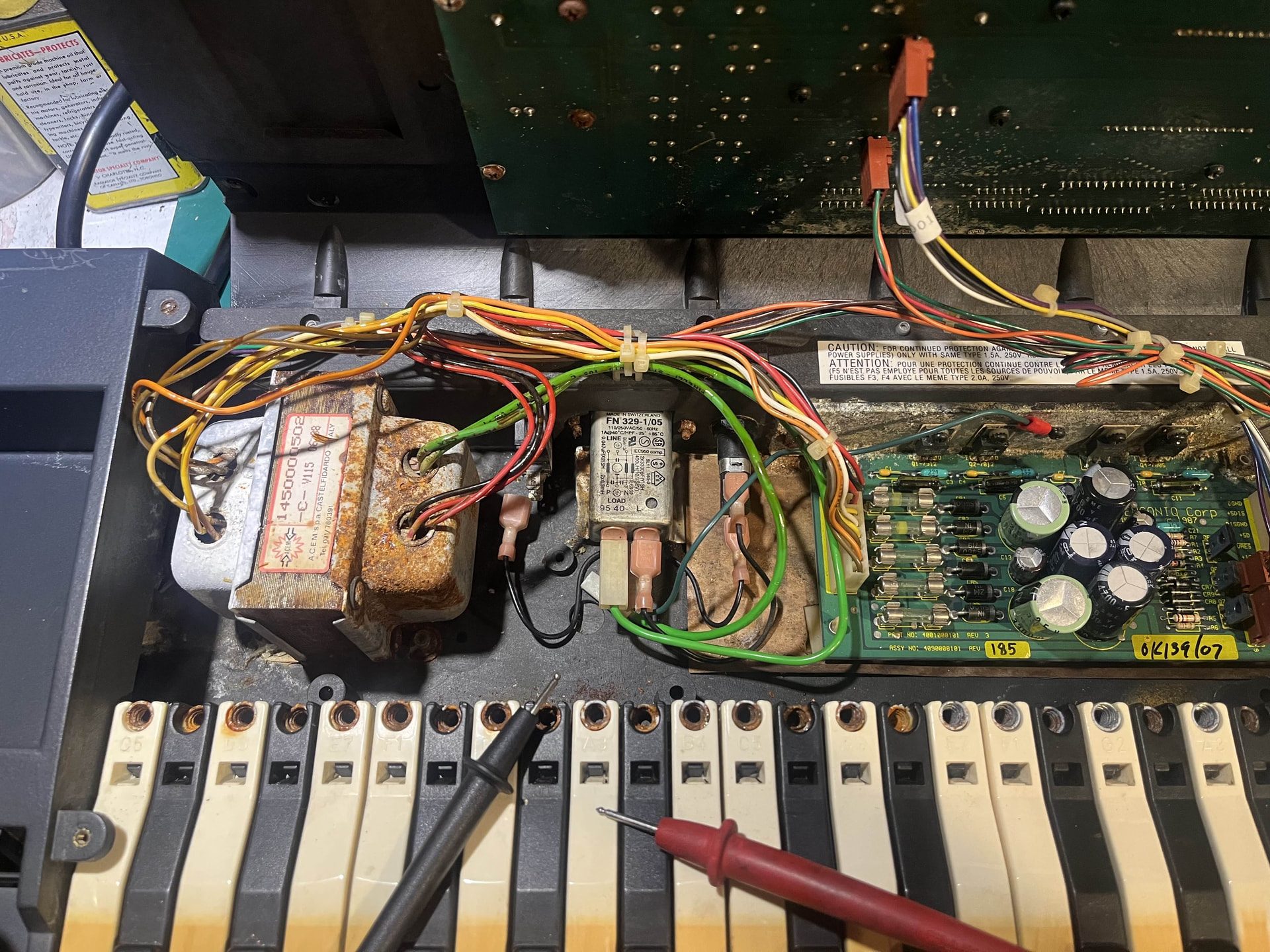 I started off with checking if I was getting power. No continuity on the power switch let me know it was broken. I ordered and swapped in a replacement (thanks for the switch Syntaur) and checked my fuses which were all good. Then using Buchty’s service manual, I was able to check the voltages of my power supply and they were all within spec (despite how gross my transformer looks).