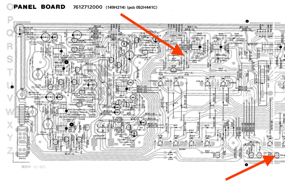 Attention: this drawing from the service manual shows the view from the component side. If you look at the mounted panelboard with the panel opened, then you have to think this drawing flipped vertically (TR14 is at the top)